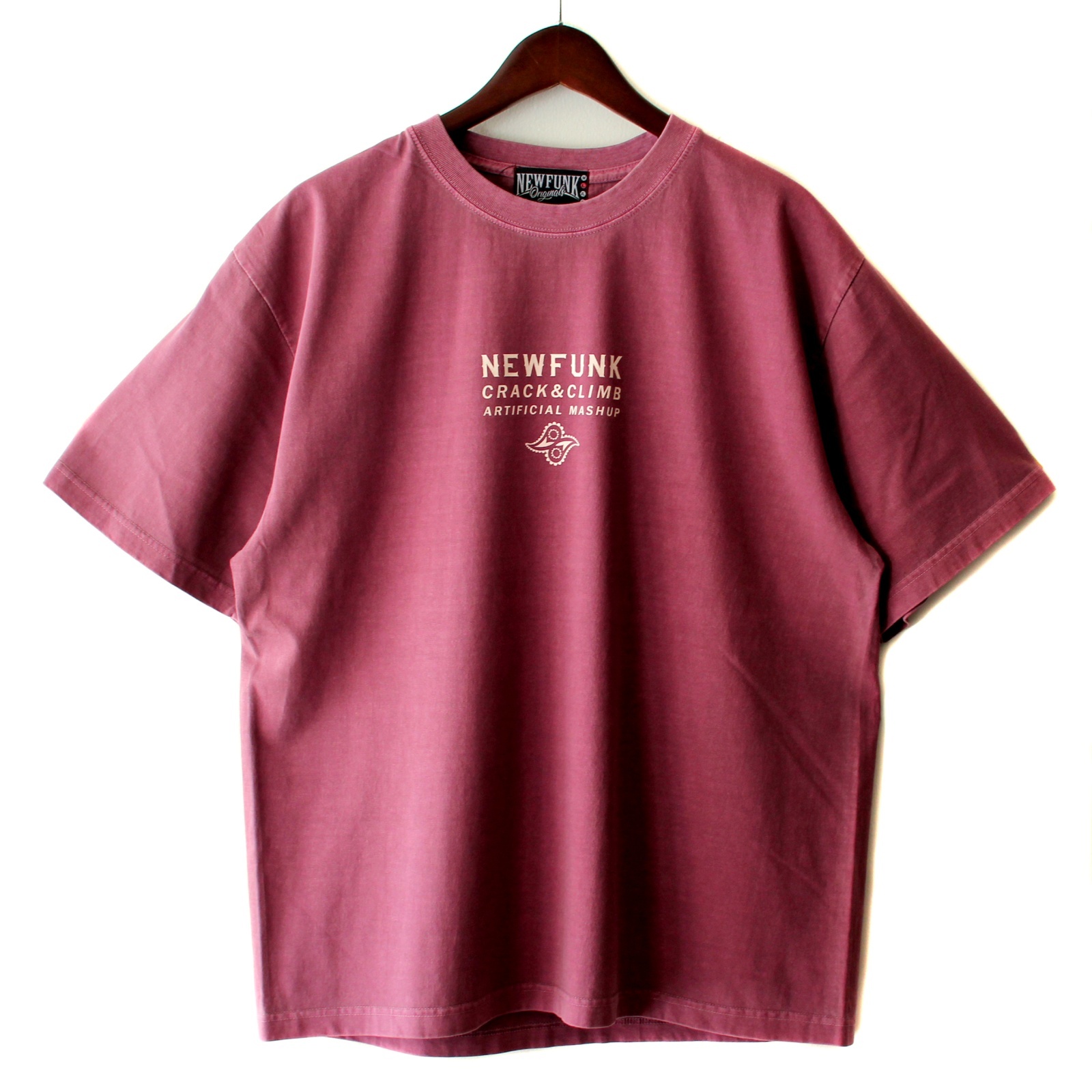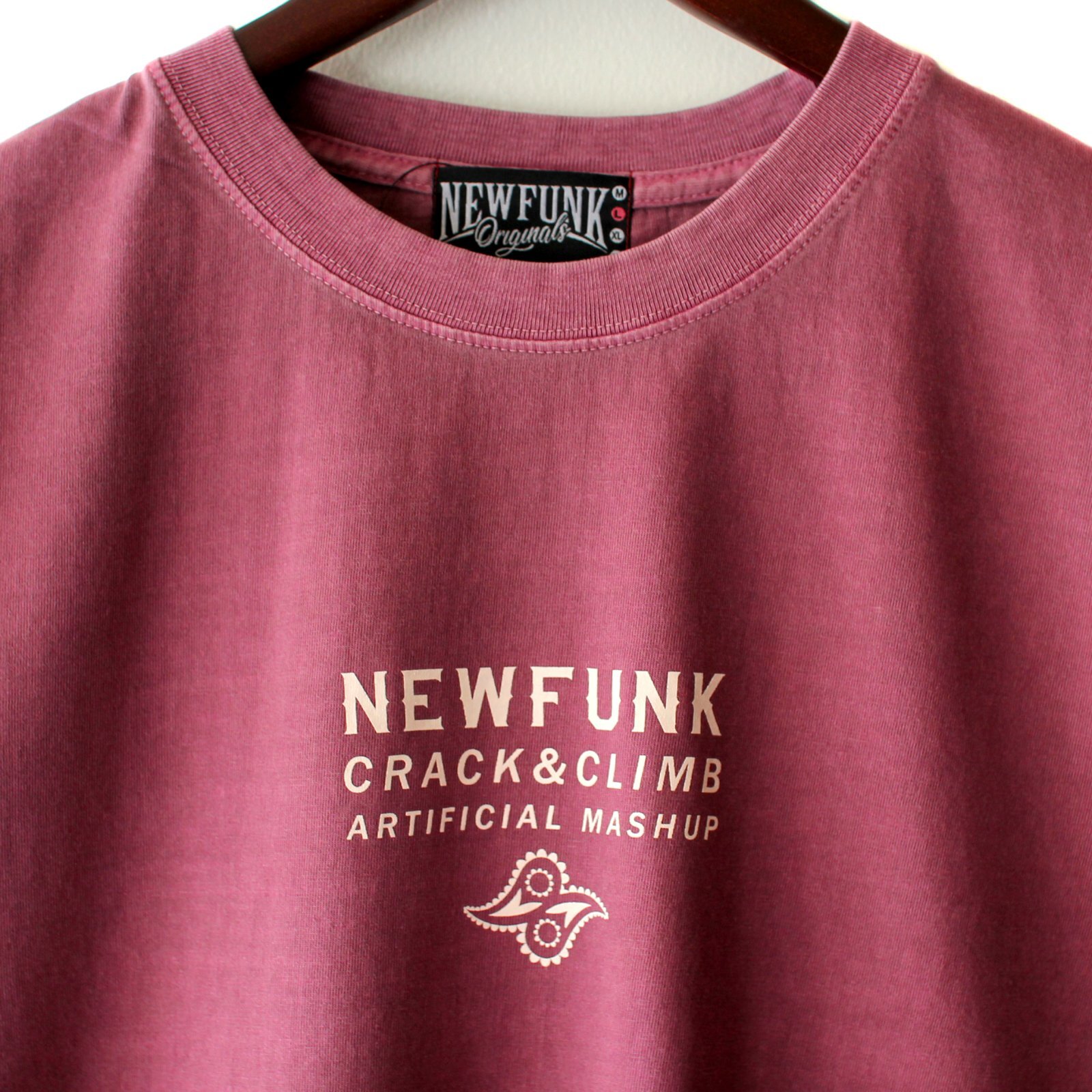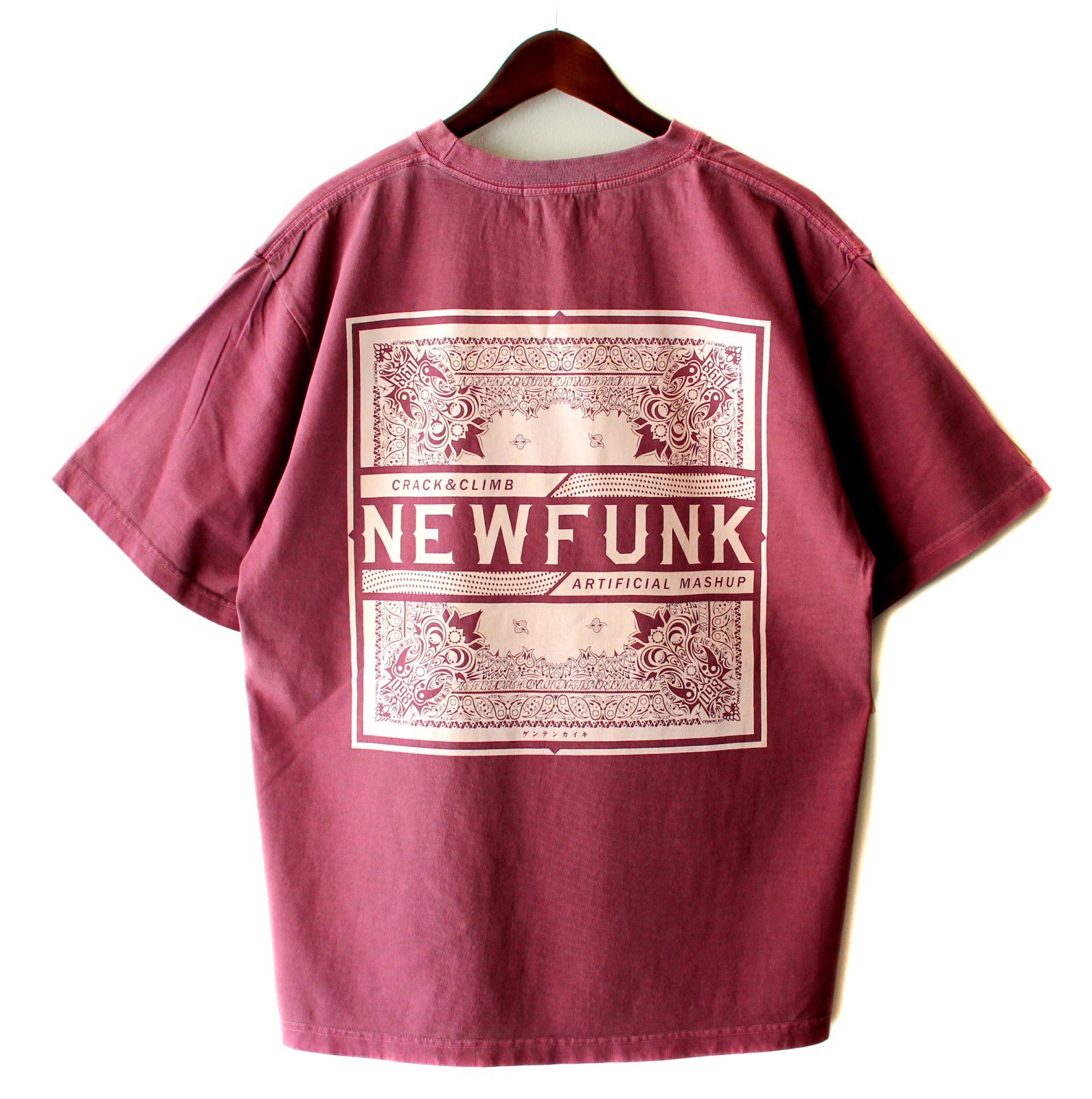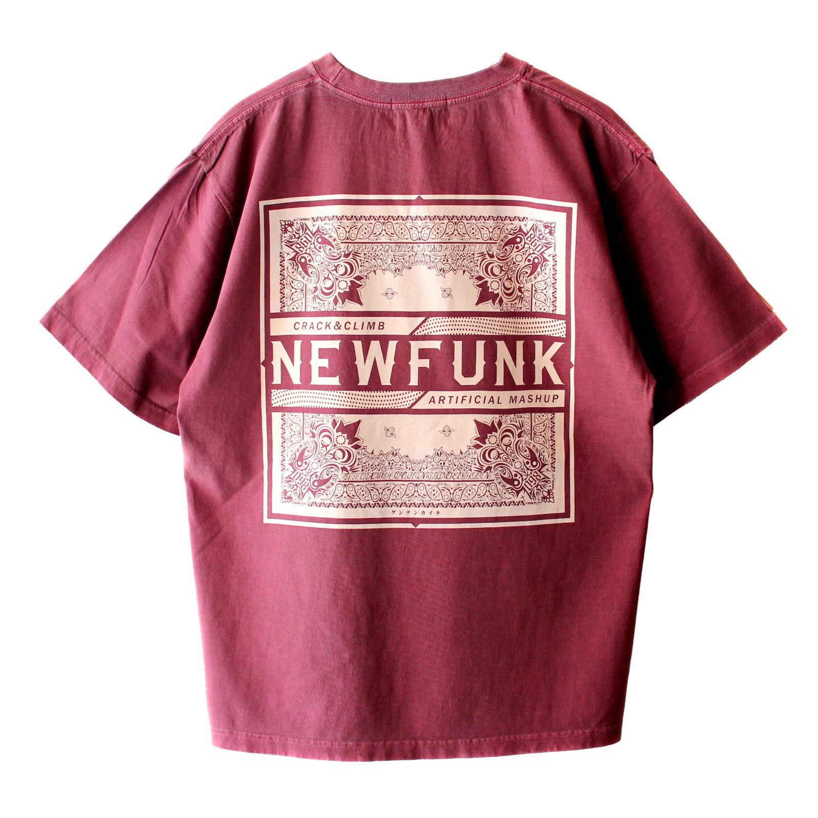 NEWFUNK Originalsのピグメント染めを施したボディーのTシャツです。何年も着古したようなヴィンテージ感を再現。まるで「状態のよい古着」のような1枚となっています。定番オリジナルペイズリーバンダナ柄をワンカラーでシンプルに表現したデザイン。フロントにブランドネーム、バックにバンダナデザインがプリントされています。