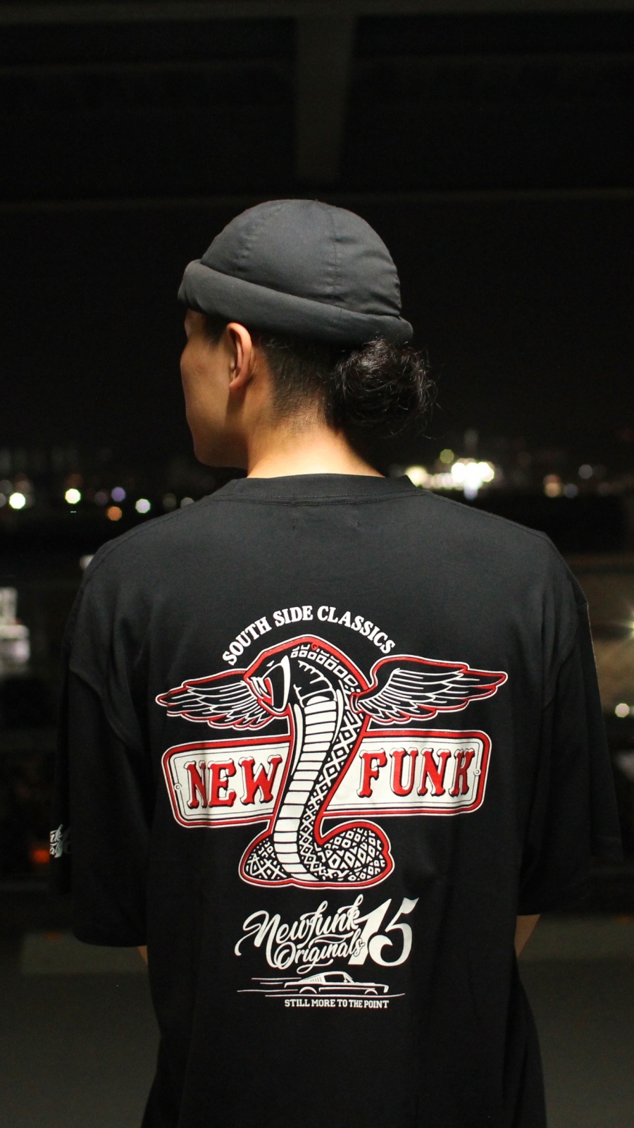 NEWFUNK STOREの15周年を記念したデザインのTシャツです。2025年が巳年という事もあり、蛇をモチーフに採用。それと「15の夜」にかけてモータースポーツの雰囲気をデザインに昇華させた、ショップ15周年記念デザインTシャツです。