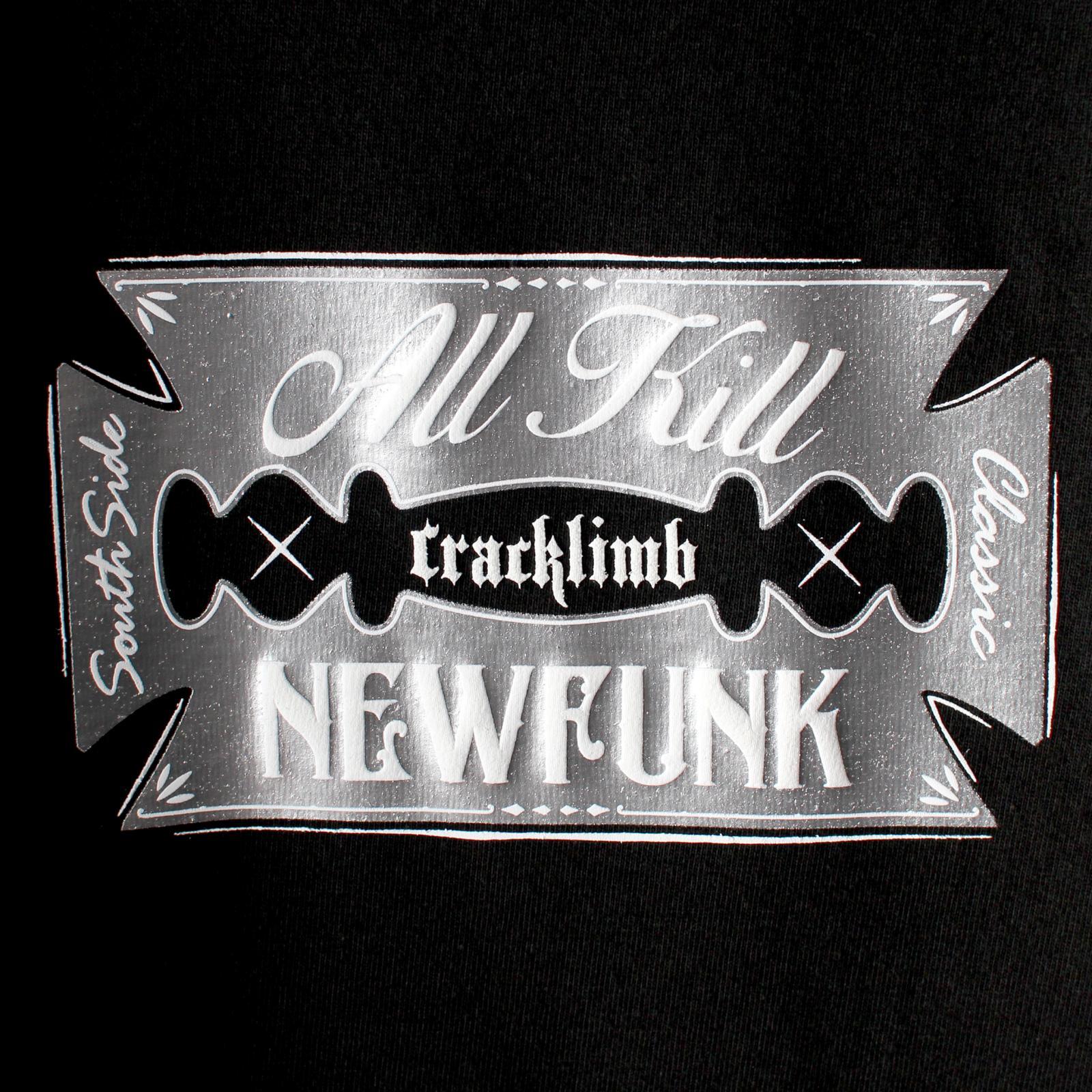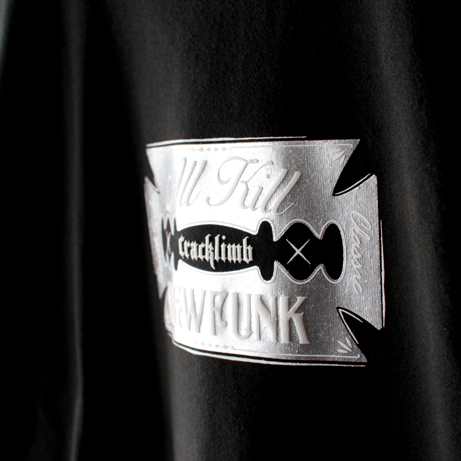 カミソリの2枚刃をかたどったデザインです。光を反射するような特殊インクを使用する事で"鉄感"を表現。ロゴや文字を発泡インクで膨らませ、「特殊インク×特殊インク」の盛りモリの仕様となっています。