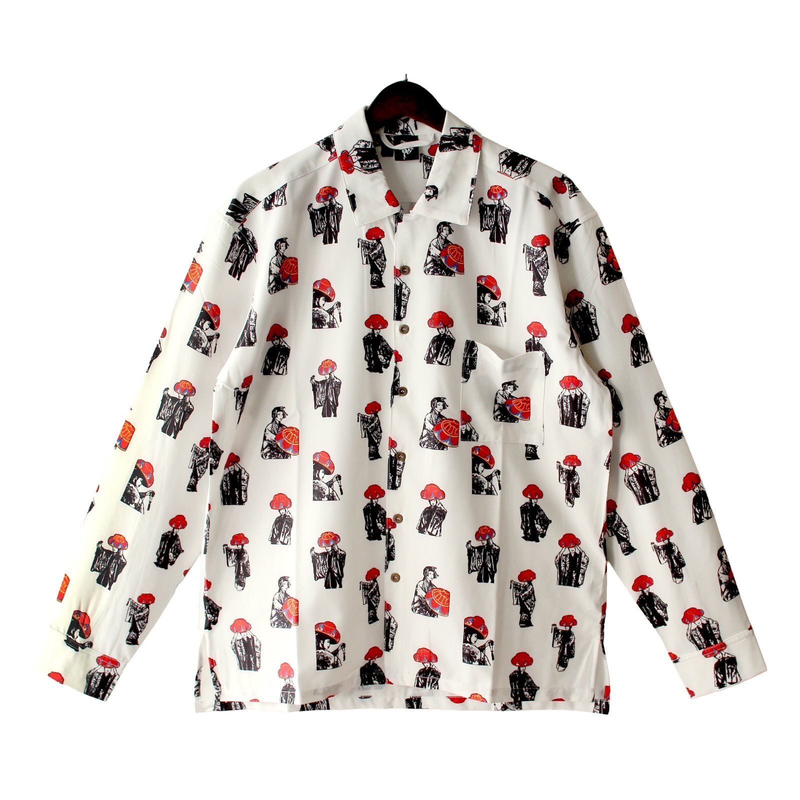 【Ryukyu Pride Wear】Open Collar Long Sleeve Shirt -花笠- (White)