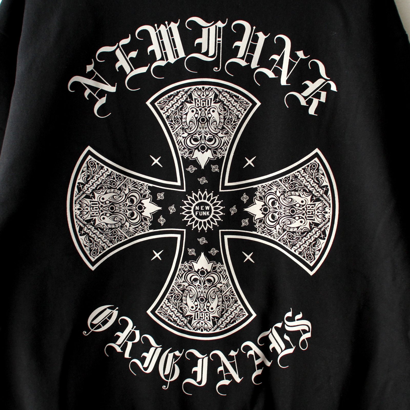 オールドイングリッシュ書体を大胆に配置。直球にバンダナ柄で合わせました。フロント胸、バック、袖にプリントが入ります。立体的なフードや大きめのアームホールなどが特徴で、15oz極厚スウェット生地のフーディーです。