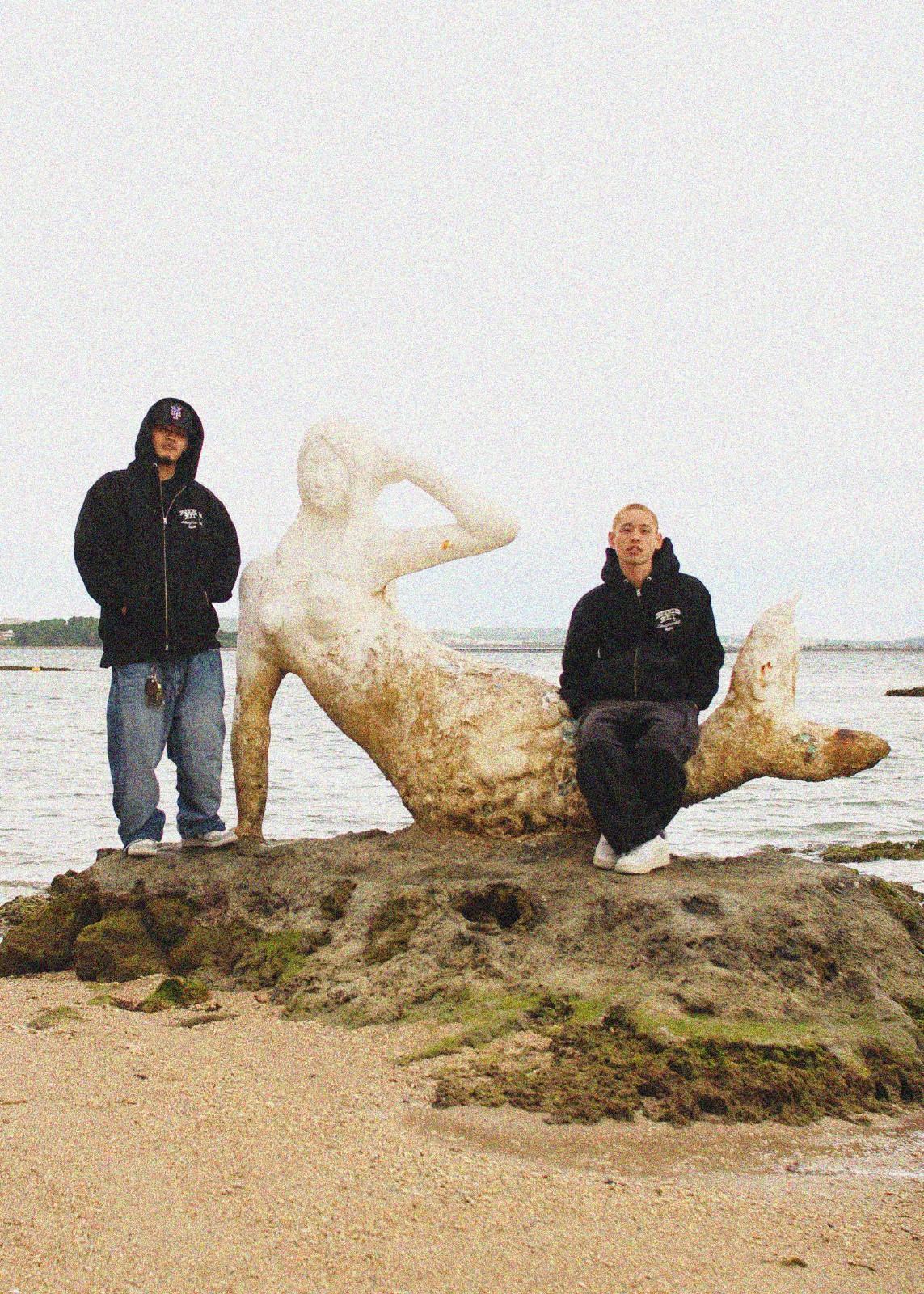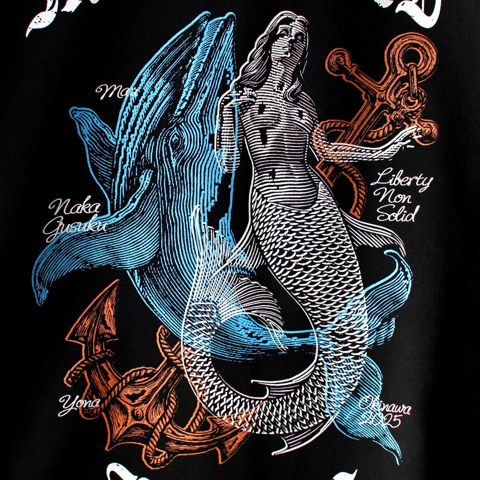 沖縄のHIPHOP Crew「LNS」がリリースした作品"MERMAID MALL"のLIVEツアーファイナルを記念して、LNS×NEWFUNKとしてコラボしたデザインのマグナムウェイトのフルジップフーディーです。彼らの地元、沖縄県中頭郡中城村にあるショッピングモール「中城モール」にある"クジラの壁画"や"人魚のモニュメント"をモチーフに製作されたデザインです。フロント胸、バック、袖にプリントが入ります。立体的なフードや大きめのアームホールなどが特徴で、15oz極厚スウェット生地のフーディーです。
