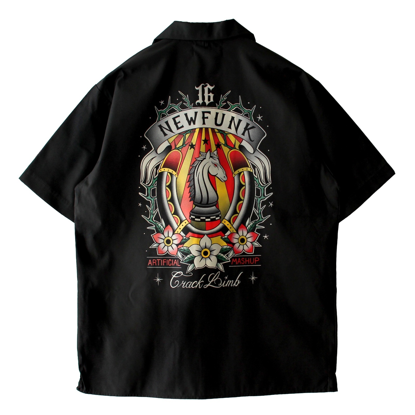 NEWFUNK STOREの創立16周年を記念したデザインのオープンカラーシャツです。2026年が午年という事もあり、馬をモチーフにTATTOデザインを採用。ホースシュー(馬蹄)タトゥーは、U字型が「幸運を受け止めて溜め込む」とされ、幸運・魔除けなどの意味合いがあるデザインです。