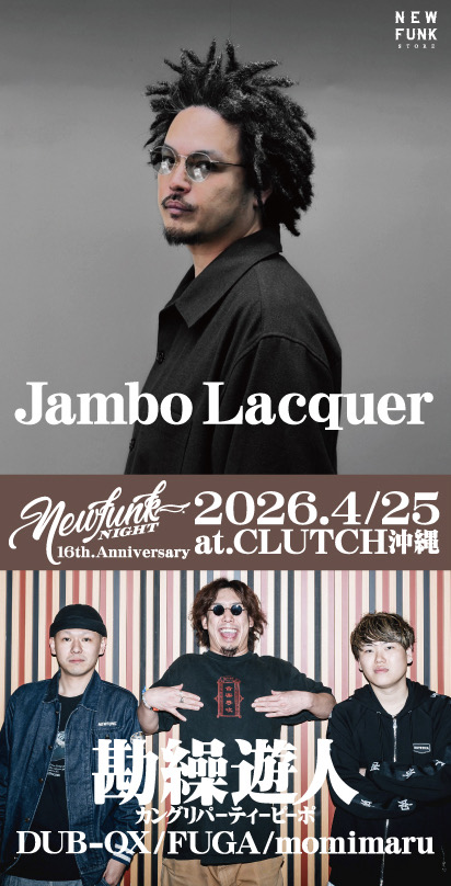 NEWFUNK STOREの16周年記念パーティーです!スペシャルゲストに、沖縄ライブが久しぶりなラッパー/ビートメーカー【Jambo Lacquer ジャンボラッカー】氏と、昨年行われたヒューマンビートボックスの大会「TOSHITORI vol.3」で見事優勝/日本一に輝いたチーム【勘繰遊人 カングリパーティーピーポー】の2組を軸として、沖縄ローカルも盤石の布陣で贈るアニバーサリーパーティーです!!